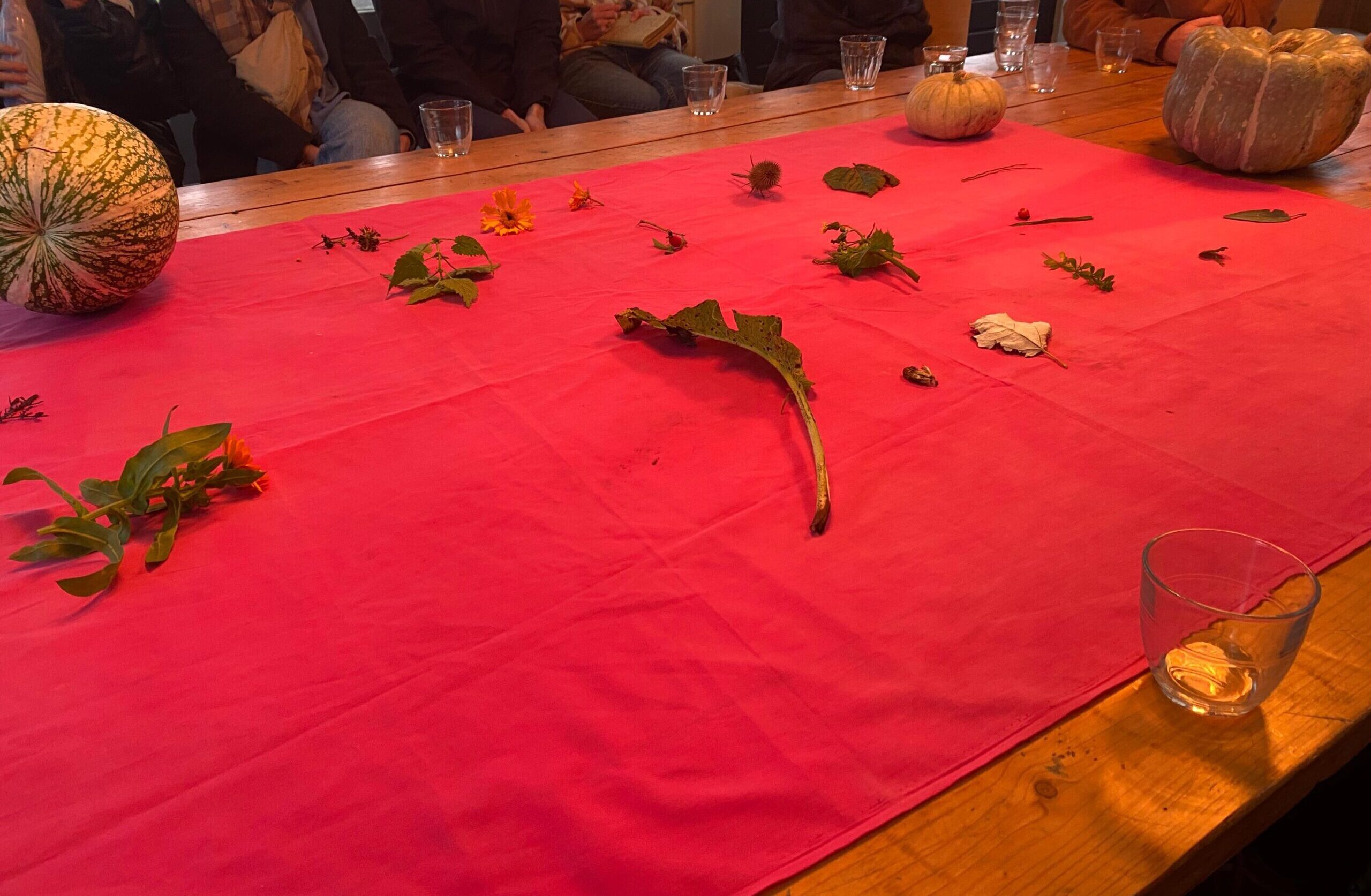 As an exercise in knowledge sharing, Müge and Emiel sent us into the garden to pick whatever plant appealed to us and bring it back inside. With all our finds laid out on a large pink tablecloth, we shared whatever knowledge or memories were attached to the plants we picked. What followed was a rich exchange that took us from the importance of grass to gardening through the culinary and medicinal properties of nettles to the application of horsetail as glaze for ceramics. Müge pointed out the connection between plant knowledge and medicine sovereignty, as knowledge about the natural healing properties of certain plants has increasingly become an object of scientific and corporate knowledge, instead of communal knowledge. It was an exercise befitting the nature of the project, rich in unexpected encounters (human and non-human alike) and learning together. Many thanks to Müge and Emiel for their hospitality, and for graciously sharing their time and knowledge.